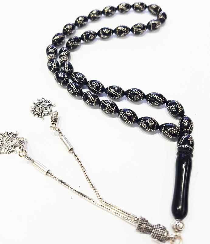 Gümüş işlemeli gümüş püsküllü hakiki oltu taşı tesbih