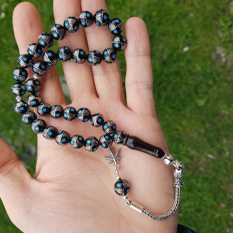 Mavi mineli gümüş işlemeli gümüş püsküllü özel işçilikli oltu taşı tesbih.